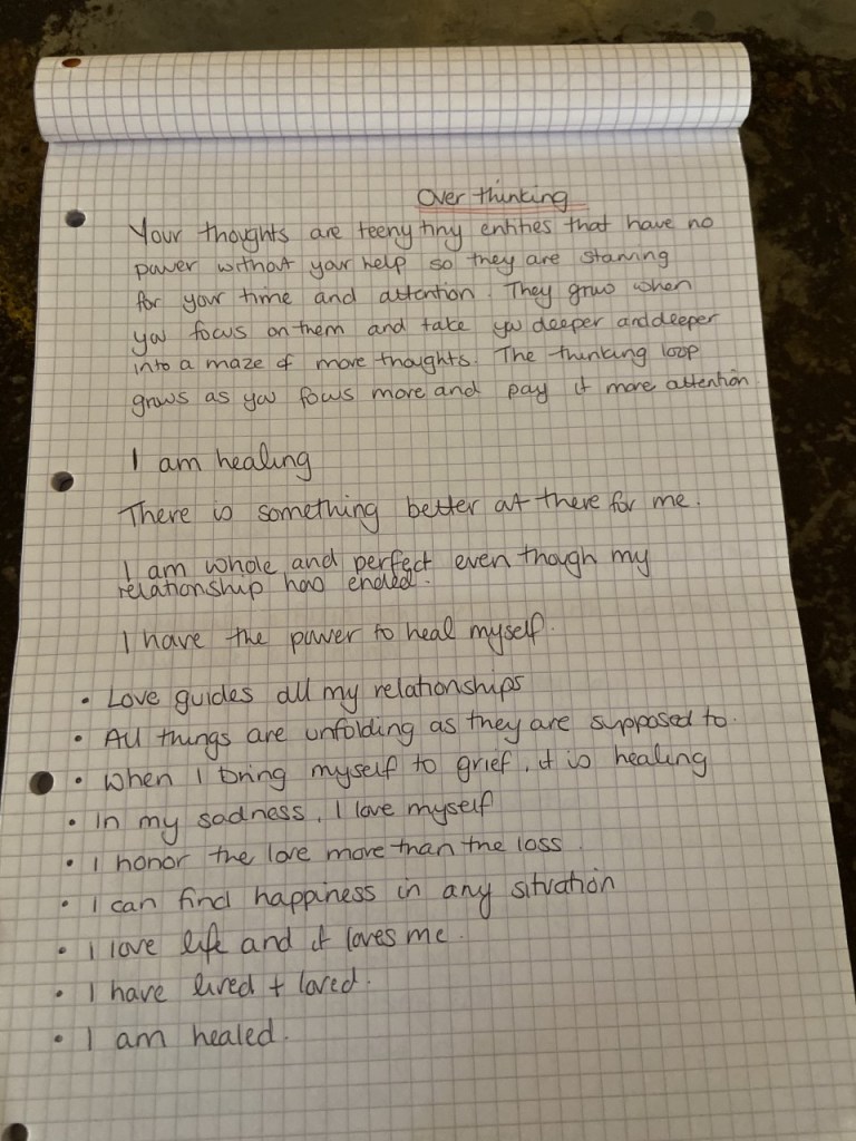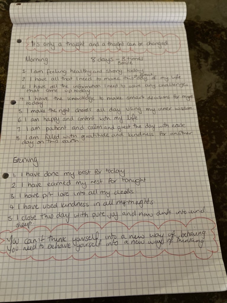 With further research I came across affirmations. I began reading about affirmations, halfheartedly writing down affirmations that I felt that I needed but I was scoffing at them when I was writing them, wondering ‘How the hell is this going to make any difference to me?’. However, I knew that I just did not want to feel like this anymore, I couldn’t handle it or the self-pity.